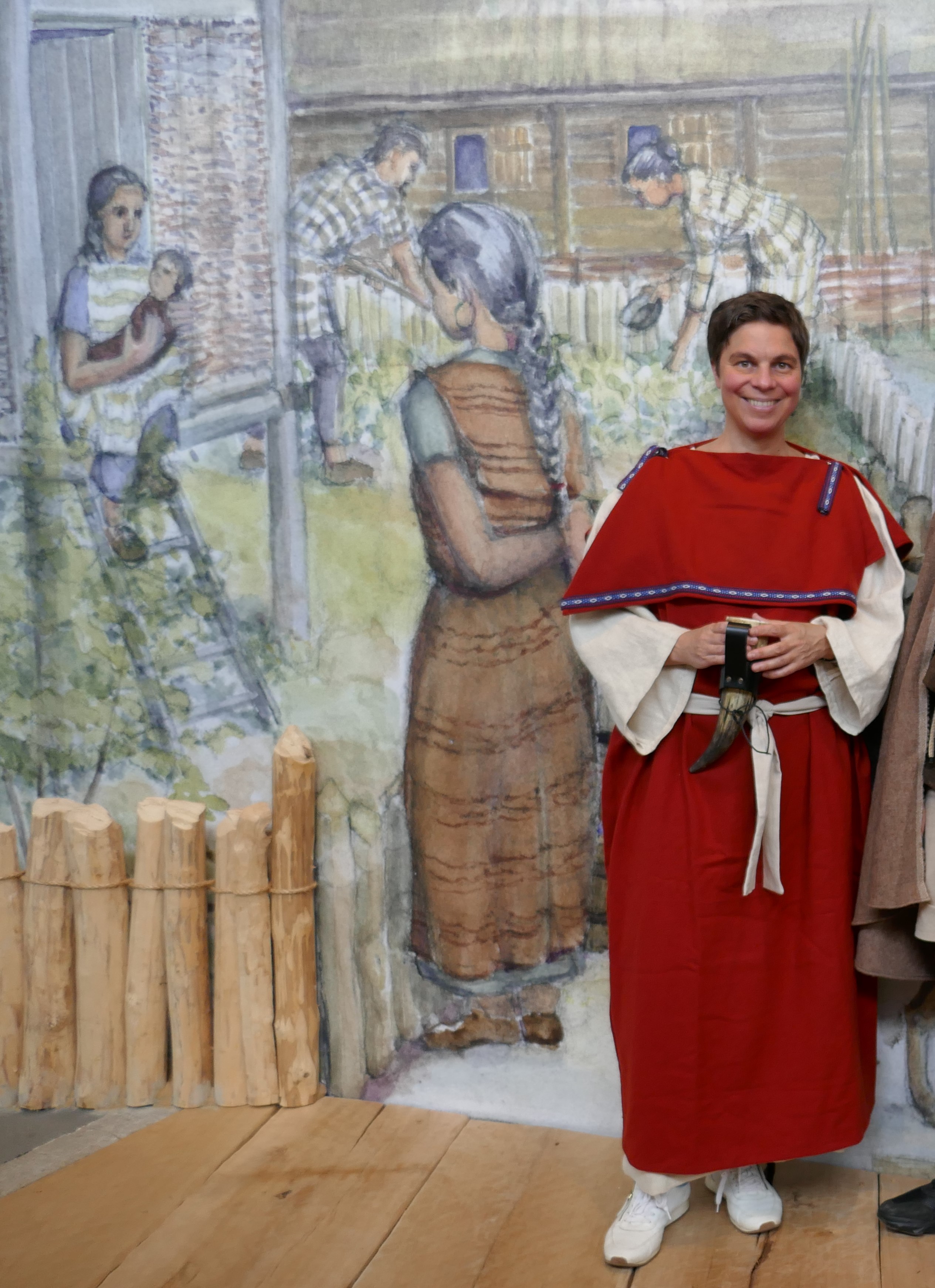 Vor unserem Lebensbild mit dem Blick ins keltische Dorf liegen verschiedene "keltische" Kleidungsstücke sowie Schild, Schwert und Trinkhorn. Hier kann die ganze Familie zur "Keltenfamilie" werden und sich per "Selfie" in die Keltenzeit begeben.